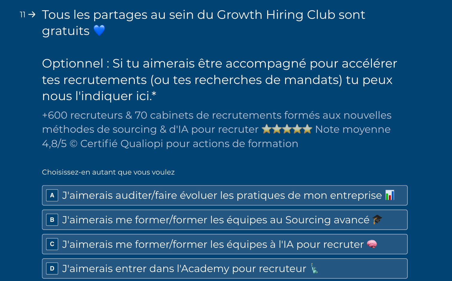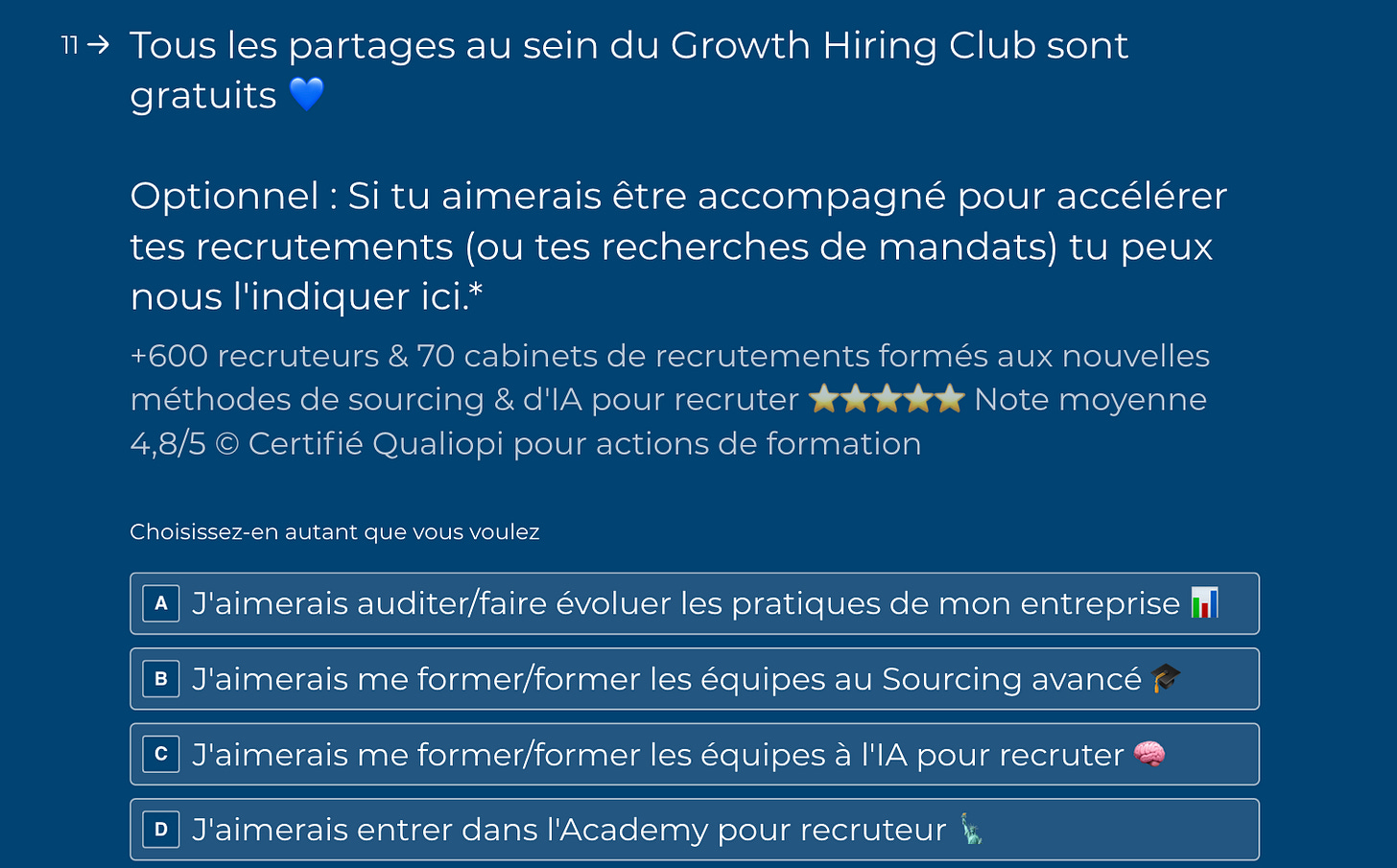 Dans mon cas, lorsqu’une personne entre dans notre Club (notre communauté gratuite de recruteurs), nous lui demandons systématiquement si elle souhaiterait se former.